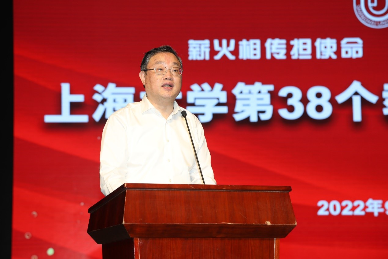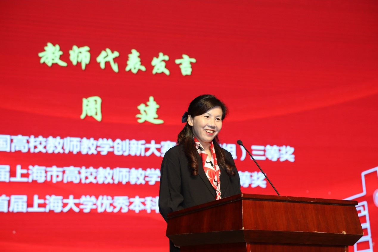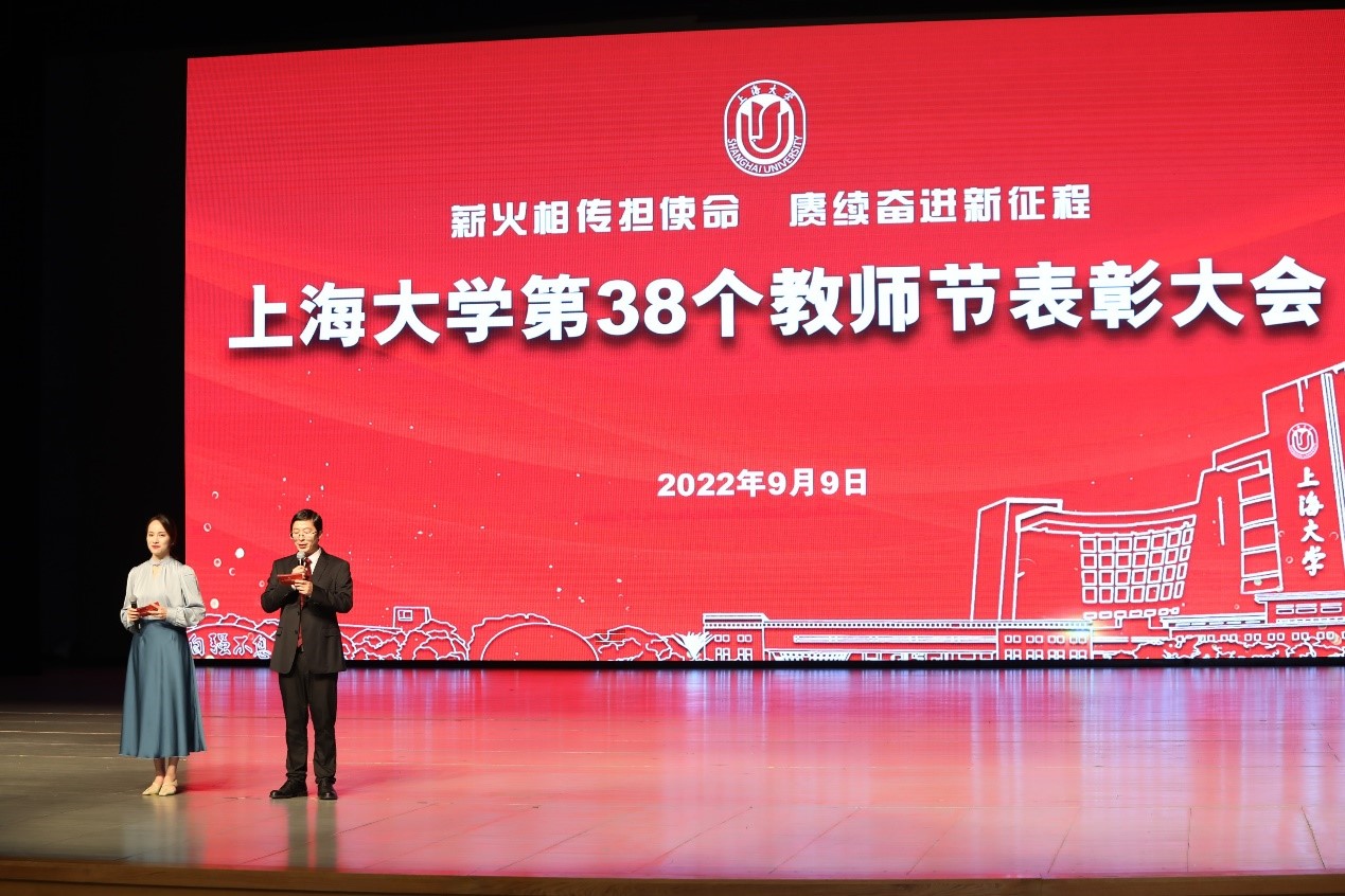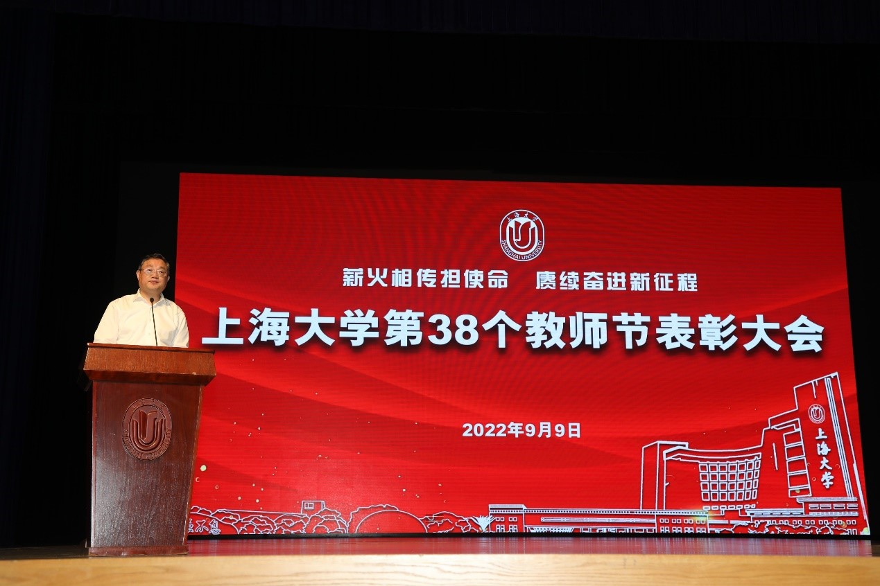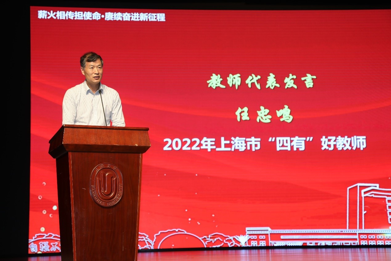 浇花浇根,育人育心。择一事终一生,2022年上海市“四有”好教师(教书育人楷模)获得者任忠鸣教授,坚守“为党育人,为国育才”,甘当人梯,把全部精力和满腔热情献给教育事业,致力做“四有”好老师。教师代表周建教授也分享了她的经历和感言,坚守三尺讲台,潜心教书育人是他们的追求,亦是每一位上大教育工作者无悔的选择。