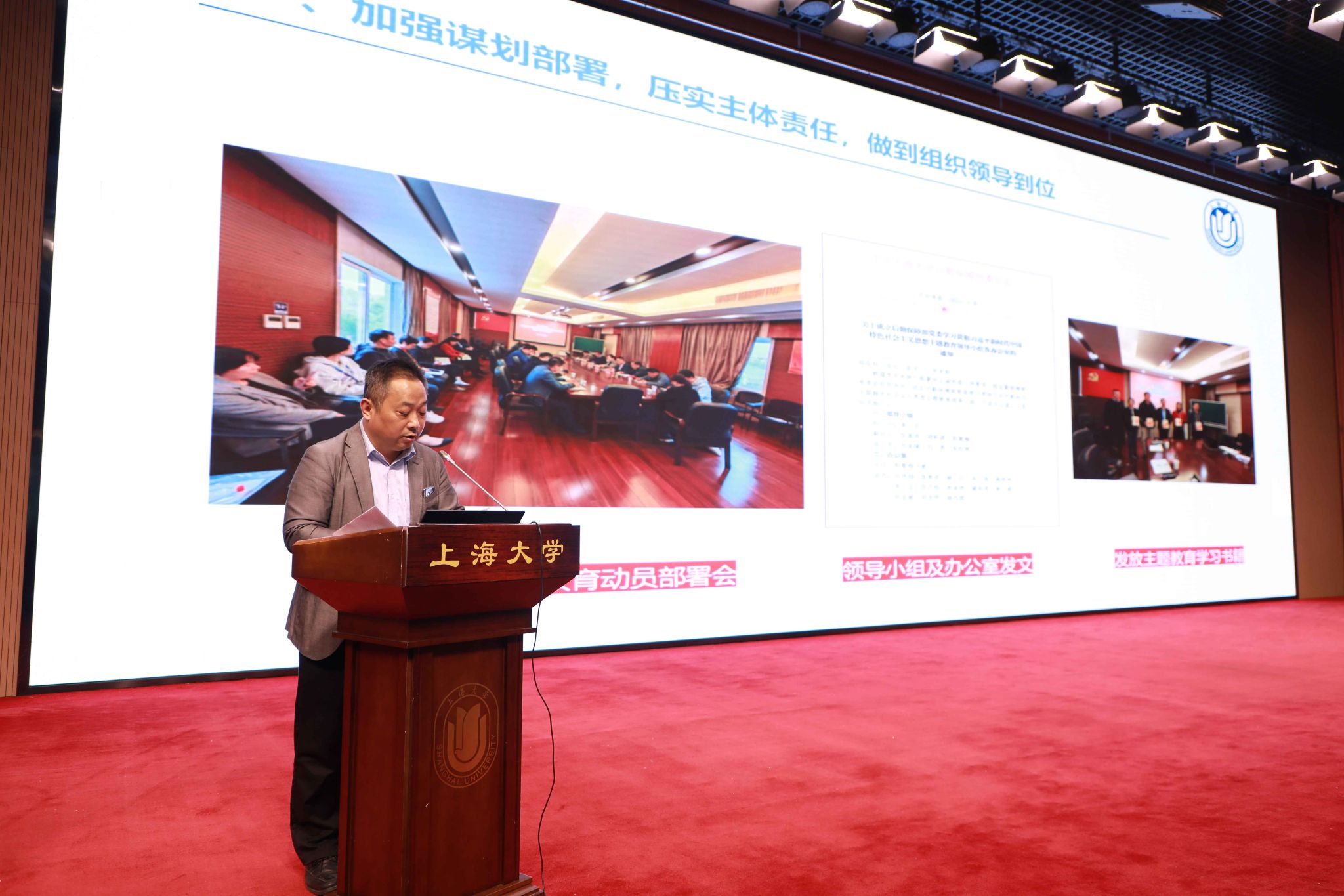 文学院党委书记陆甦颖、生命科学学院党委书记陈付学、上海美术学院党委书记陈静、新闻传播学院党委书记王晴川、后勤保障部党委书记李坚分别代表五个小组作了交流发言,集中反馈了分组研讨成果,并交流介绍了本单位的主题教育特色工作。