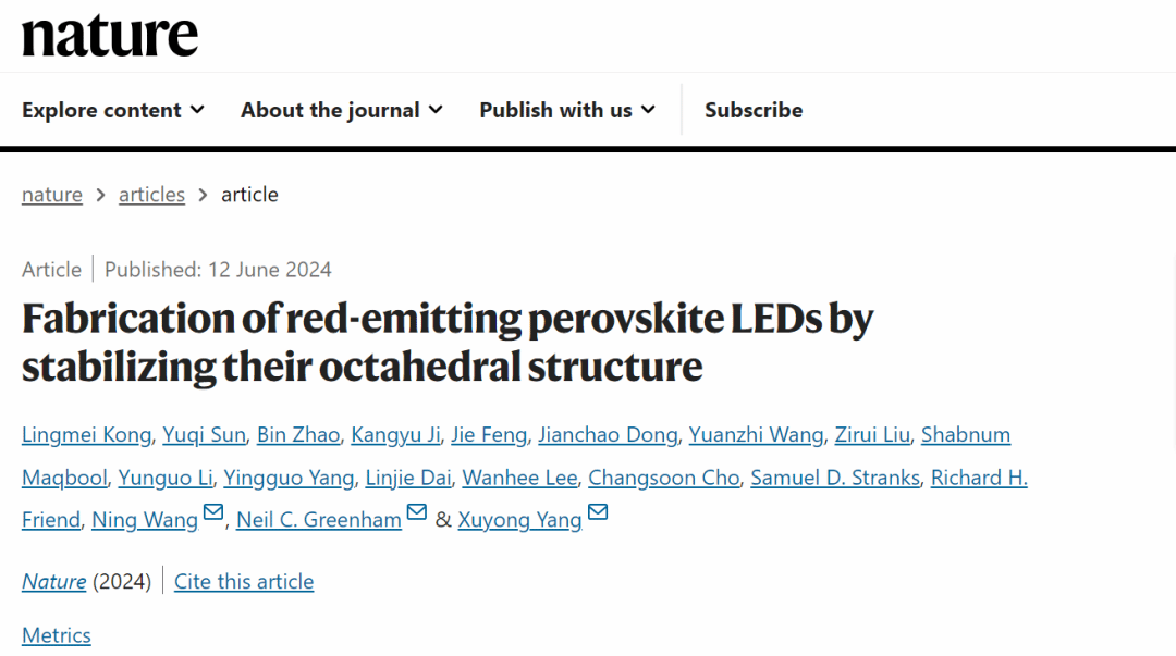 该研究成果也是杨绪勇教授研究团队继2023年以共同通讯作者在Nature上发表钙钛矿LED领域研究论文以来(https://www.nature.com/articles/s41586-023-06514-6),在该领域取得的又一里程碑式的突破性研究进展。此外,杨绪勇教授课题组的另一项钙钛矿显示相关的重要工作也于同一天在国际顶级光学期刊《Light:Science&Applications》(Nature子刊)上在线发表(https://doi.org/10.1038/s41377-024-01500-7)。