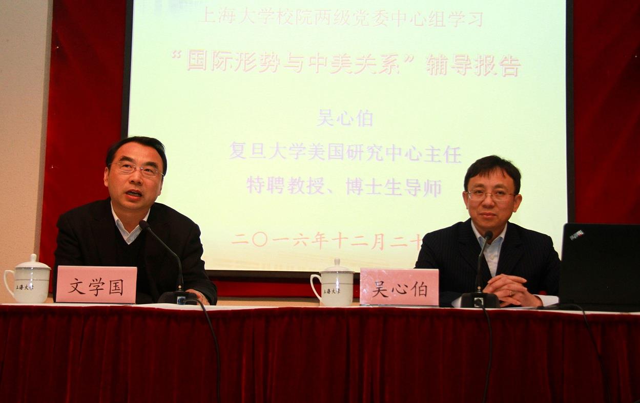气氛热烈的互动之后,文学国副校长对吴心伯教授的精彩报告表示了感谢,他指出吴教授介绍了一年来的国际关系及中美关系的变化,推演了中美关系的走向,让大家对中美关系有了大致的认识。报告内容生动、启发多,引发了与会师生对国际问题的兴趣。同时,他进一步指出“国之交在于民相亲”、“天下熙熙皆为利来,天下攘攘皆为利往”,中西方已相互离不开对方,中美关系归根到底是背后隐藏的利益关系,中国还是要做好自己。最后,他希望上大能够进一步增强与各高校的学科交往,也希望大家能够进一步提升国际视野,加强国际形势的学习,为高水平大学建设出谋划策。