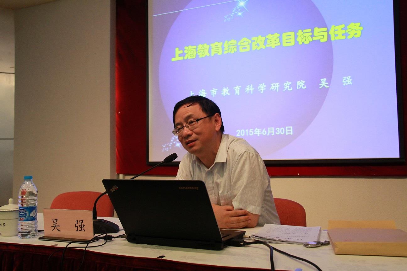 吴强书记首先总体介绍了党的十八大和十八届三中全会部署的深化教育领域综合改革的情况以及上海城市发展和上海教育发展的定位。接着,他从上海教育综合改革的总体要求;坚持立德树人、回归育人本源;促进高校准确定位、特色办学;提高教育教学质量;建设一流师资队伍;提升学科专业建设和科研创新水平;改革教育经费投入方式;构建现代大学制度;高等学校考试招生制度改革九个方面,围绕上海教育综合改革的目标与任务进行了介绍。在介绍上海教育综合改革的总体要求时,他以上海交大综合改革方案目标设定为例,指出交大的改革方案以制度激励为核心,同时指出,大学文化是学校的核心和灵魂,是学校的价值观、战略目标和定位。他还列举了上海理工大学、戏剧学院、上海交大的人才强校案例来说明教育综合改革的重要性。最后,他总结了高校推进教育综合改革要注重的倾向,一要防止等靠要,克服畏难、埋怨、推卸、观望;二要防止碎片化,避免各自为阵,缺乏系统推进;三要防止大而全,注重立足实际,聚焦重点;四要防止重发展轻改革,也要防止只顾改革不重依法守规、风险控制;五要防止凭主观意志改革,当前改革成为今后改革的负担;六要防止领导热教职工冷,缺乏群众参与和压力传递。
