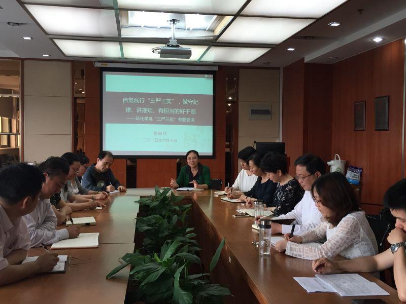 6月10日下午,副校长吴明红为环化学院作题为“自觉践行三严三实,做守纪律、践行规矩、有担当的好干部”的专题党课,同时就深入学习习近平总书记关于“三严三实”的讲话精神,进一步提高学院党员干部思想认识进行了动员部署。学院党政领导、系所负责人及支部书记等共16人参加了本次党课学习。