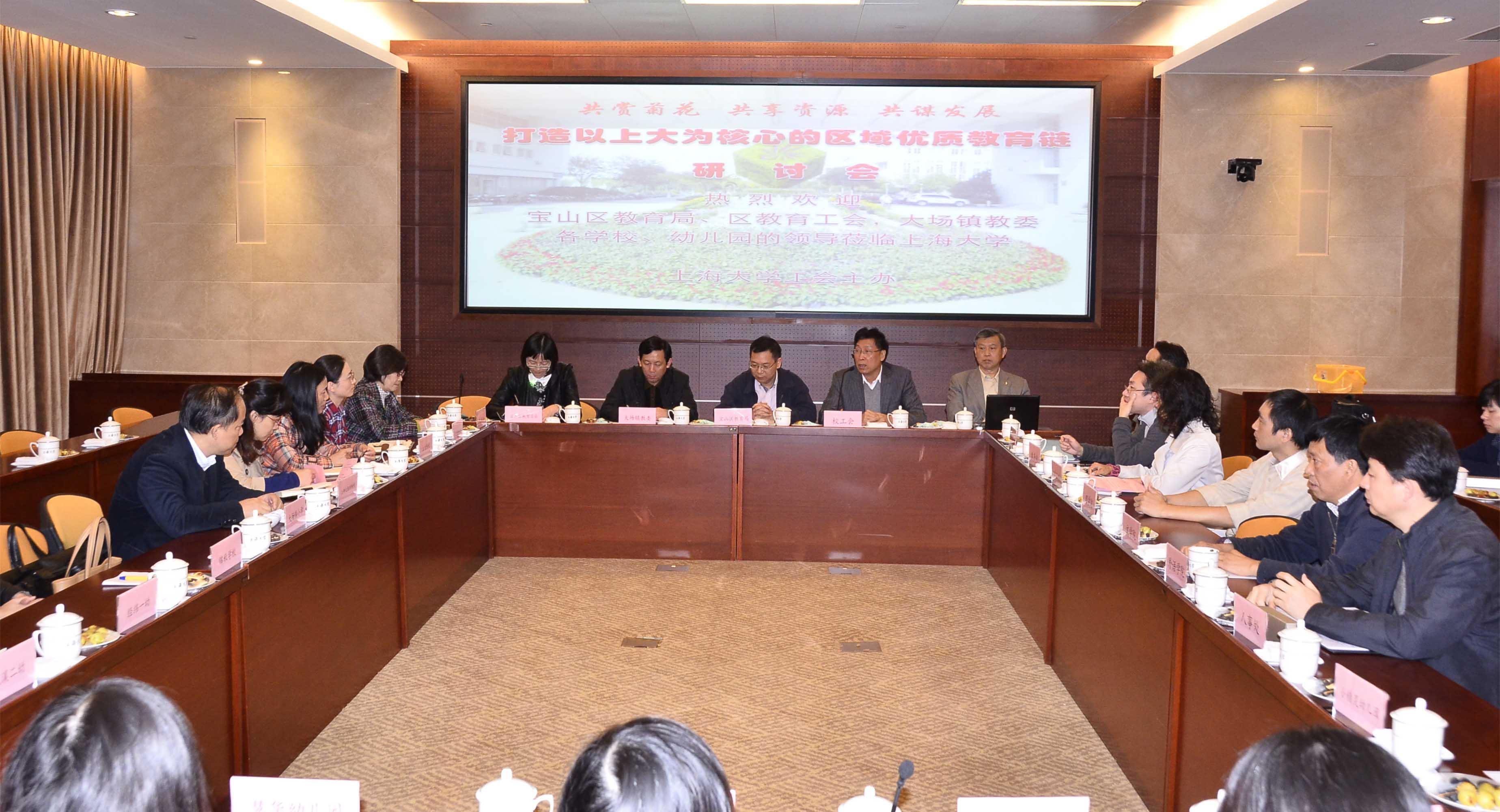 在我校菊文化节期间,11月13日校工会邀请了宝山区教育局、大场镇教委、上大附中、上大附校以及周边的中小学、幼儿园等各类教育单位来我校参加“打造以上大为核心的区域优质教育链”研讨会。宝山区教育局陆荣林副局长、宝山区教育工会副主席李霞、大场镇教委主任左忠明,以及上大周边的高中、初中、小学、幼儿园领导出席了会议。