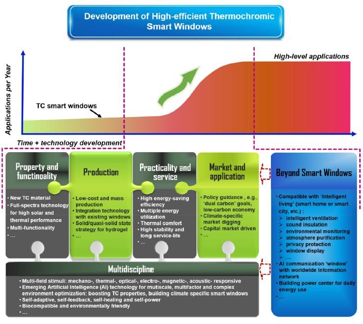 该综述内容包括:第一,总结了二氧化钒热致变色智能玻璃的研究进展,从原子结构、相变机制、元素掺杂、纳米复合结构、多层膜结构、微纳米表面工程等方面对其相变和热致变色性能的影响,讨论了基于该材料的多功能智能玻璃的进展。第二,概述了热致变色水凝胶智能窗的调控机制和内在结构分类,讨论了性能改进策略的研究进展,包括提高机械强度和稳定性、调控临界相转变温度值、增强太阳光调控能力、冷/热调节能力等方面。第三,总结了钙钛矿的稳定存在条件,温度、湿度、溶剂等对相稳定性的影响,禁带宽度、相变温度、颜色变化、可逆性等热致变色性质,以及在智能窗上应用的详细进展。最后,针对热致变色智能窗的发展与未来挑战,论文从多物理场调制(热致、光致/电致/力致变色等)、光热/光谱技术整合(低辐射、辐射制冷、变辐射)、节能−发电一体化等方面进行了论述,指出热致变色智能窗领域的相关研究已进入快速发展阶段,未来可从材料性能与多功能化、生产制造技术、实用性与服役、市场和应用等角度加速推进,并强调了开展多学科交叉研究和推进“智能窗”之外系统性应用的重要性。