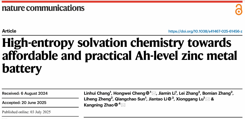 图2 HESE的高熵溶剂化结构分布及实用性电池性能展示(Nature Communications, 2025, 16, 6134)