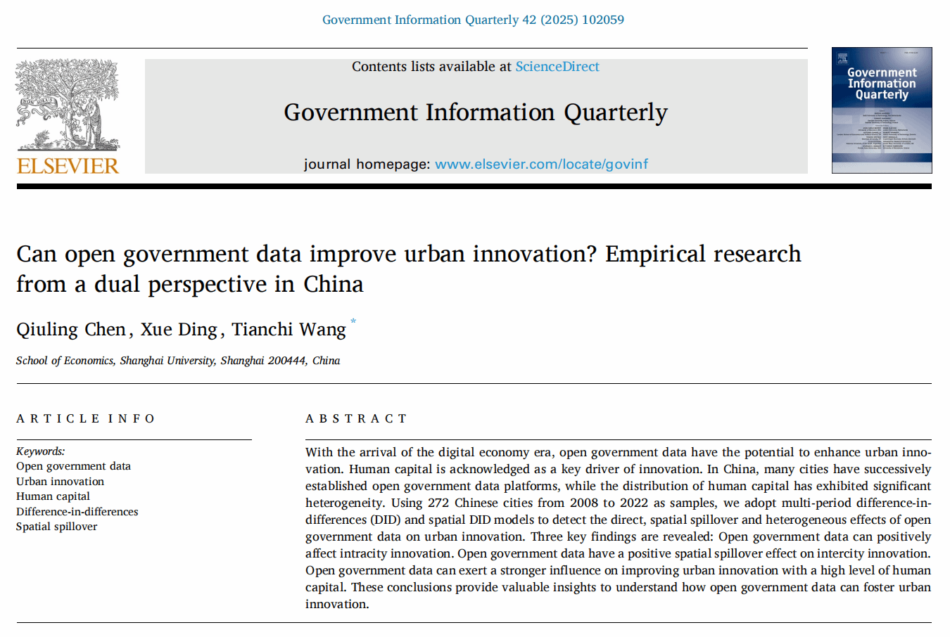 当产业政策与集群网络在人工智能领域塑造创新生态时,政府数据开放则以另一种方式重构城市创新的底层逻辑。陈秋玲教授、2023级硕士研究生丁雪、王天驰博士后共同在政府信息与数字治理领域顶级期刊《Government Information Quarterly》(中科院SSCI一区TOP期刊,最新影响因子10,五年影响因子11.1)上发表题为“Can open government data improve urban innovation? Empirical research from a dual perspective in China”的研究论文。《Government Information Quarterly》在数字政府领域排名全球首位,年发刊量60篇左右,是该领域的标杆性学术期刊,具有卓越的国际影响力。